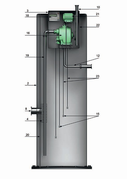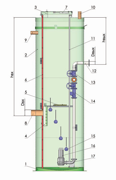 1. Дно сферическое 2. Корпус из стеклопластика 3. Крышка КНС 4. Корзина для сбора мусора 5. Технологический настил 6. Лестница 7. Амортизатор люка КНС 8. Подводящий трубопровод 9. Патрубок ввода кабеля 10. Вентиляция 11. Направляющие насосов 12. Напорный трубопровод 13. Клиновая задвижка 14. Обратный клапан 15. Поплавковые выключатели 16. Насос* 17. Пьедестал насоса 18. Щит управления 19. Всасывающие трубопроводы 20. Направляющие корзины 21. Система приводов насосов 22. Корпус блока насосов 23. Изолированный кабель